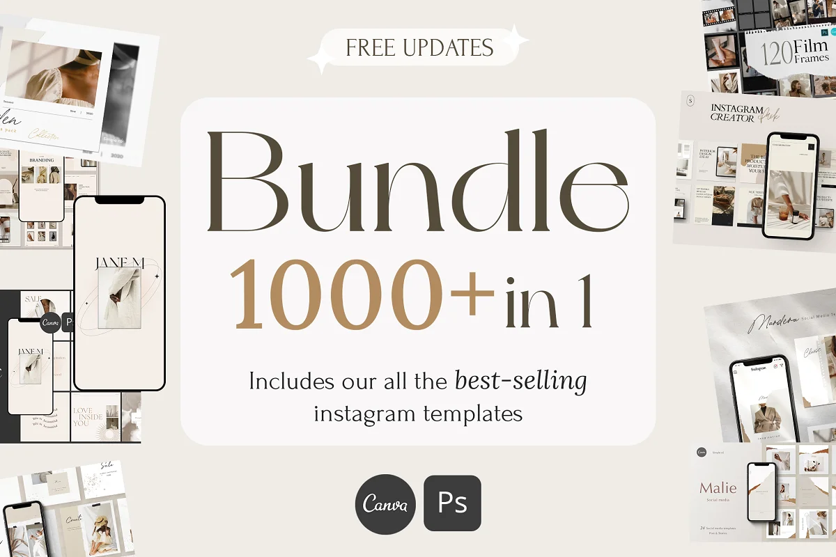 Le BUNDLE Instagram 1000+ est un kit de médias sociaux avec plus de 1000 modèles pour aider les graphistes à améliorer leurs projets Instagram. Le pack comprend deux mises à jour importantes pour les utilisateurs CANVA et PS avec une collection de modèles de haute qualité.