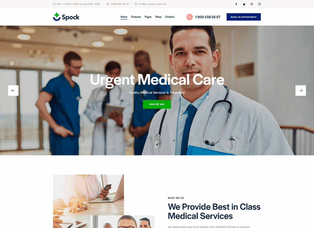 Le thème Spock WordPress est destiné à devenir un point de départ rapide pour votre site Web médical. C'est un thème WordPress multi-skin qui correspondra à vos projets pour les hôpitaux, les cliniques, les ambulances, les agences de soins infirmiers, les pharmacies, les institutions médicales, les magasins de matériel médical, etc. Le thème s'adaptera également à d'autres projets en ligne spécifiques à un sujet, comme cosmétologue, dermatologue , chirurgien, psychologue, chiropraticien, thérapie photodynamique de centre de réadaptation, etc. Il présente une mise en page extrêmement polyvalente réalisée avec le constructeur de pages Elementor. Le support complet de WooCommerce vous permet de lancer gratuitement une boutique en ligne multifonctionnelle et orientée conversion. Il n'est pas nécessaire d'être un expert en programmation pour modifier le thème. Il est fait avec Elementor et prend en charge l'édition sans code.