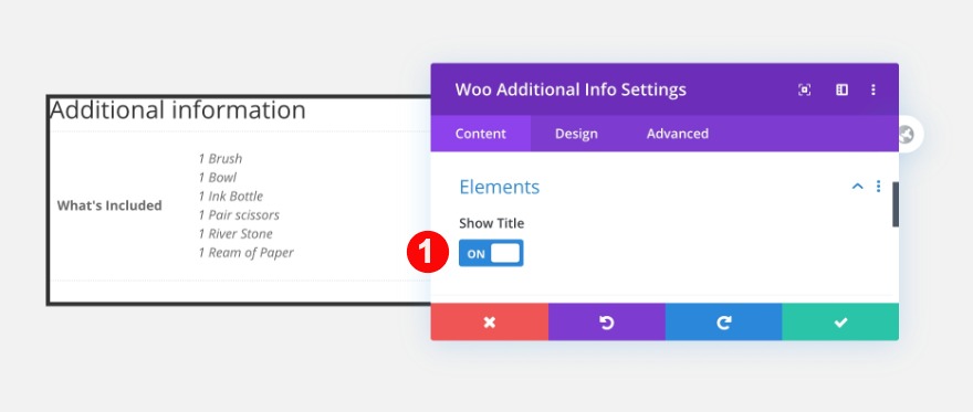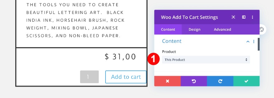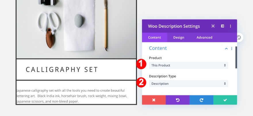 Pour continuer, ajoutez un module de description de woo. Sélectionnez le contenu et le type de description.