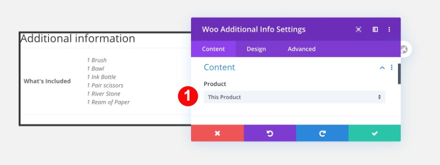 Passez à la deuxième colonne et ajoutez un module d'information supplémentaire woo. Sélectionnez le produit.