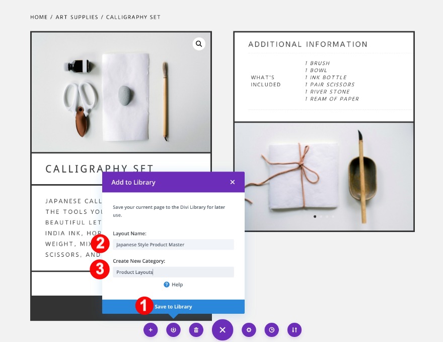 Maintenant que nous avons terminé la conception, il est temps d'enregistrer la mise en page de notre page produit dans la bibliothèque Divi. Si vous n'avez pas de catégorie pour vos mises en page de produits, créez-en une.