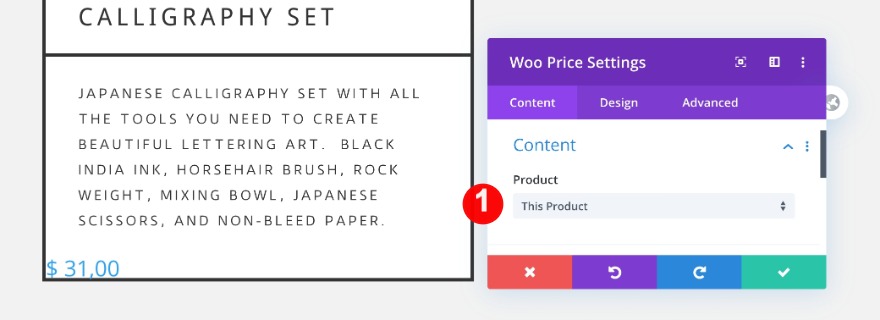 Ensuite, ajoutez un module de prix woo à la colonne et sélectionnez le produit.