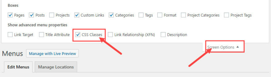 Depuis le tableau de bord WordPress, accédez à Apparence → Menus . En haut de la page des menus, cliquez sur Options d'écran et cochez Classes CSS. Cela vous permettra d'ajouter une classe CSS personnalisée à vos éléments de menu.