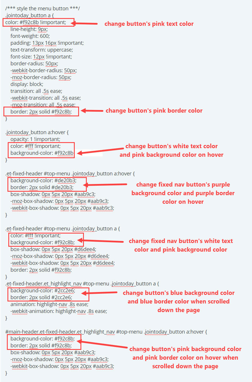 Étant donné que le bouton CTA utilise une classe CSS personnalisée, vous pouvez modifier le style du bouton pour qu'il corresponde à votre site en ajustant le CSS que vous avez ajouté précédemment. Remplacez simplement le code couleur par le vôtre. Voici les sections de CSS qui ciblent les différents styles de boutons :