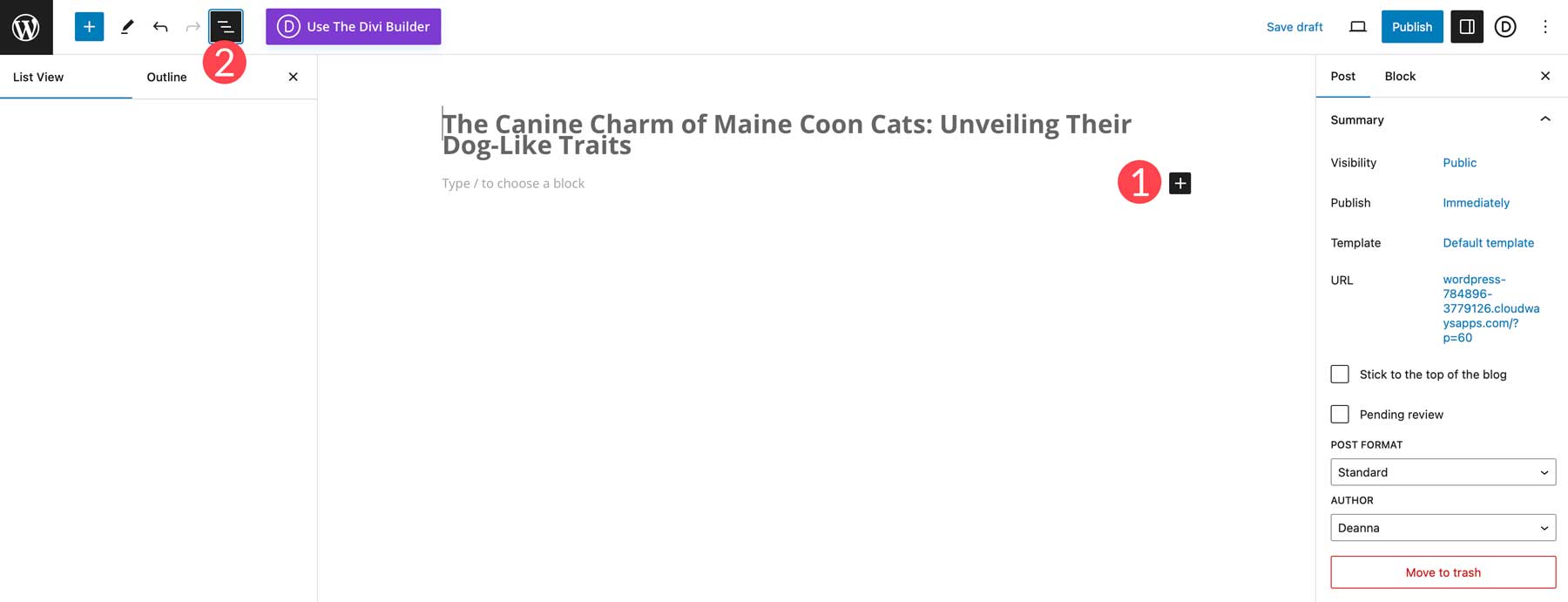 Si vous utilisez Divi, cliquez sur le bouton de l'éditeur par défaut (2) pour charger Gutenberg.