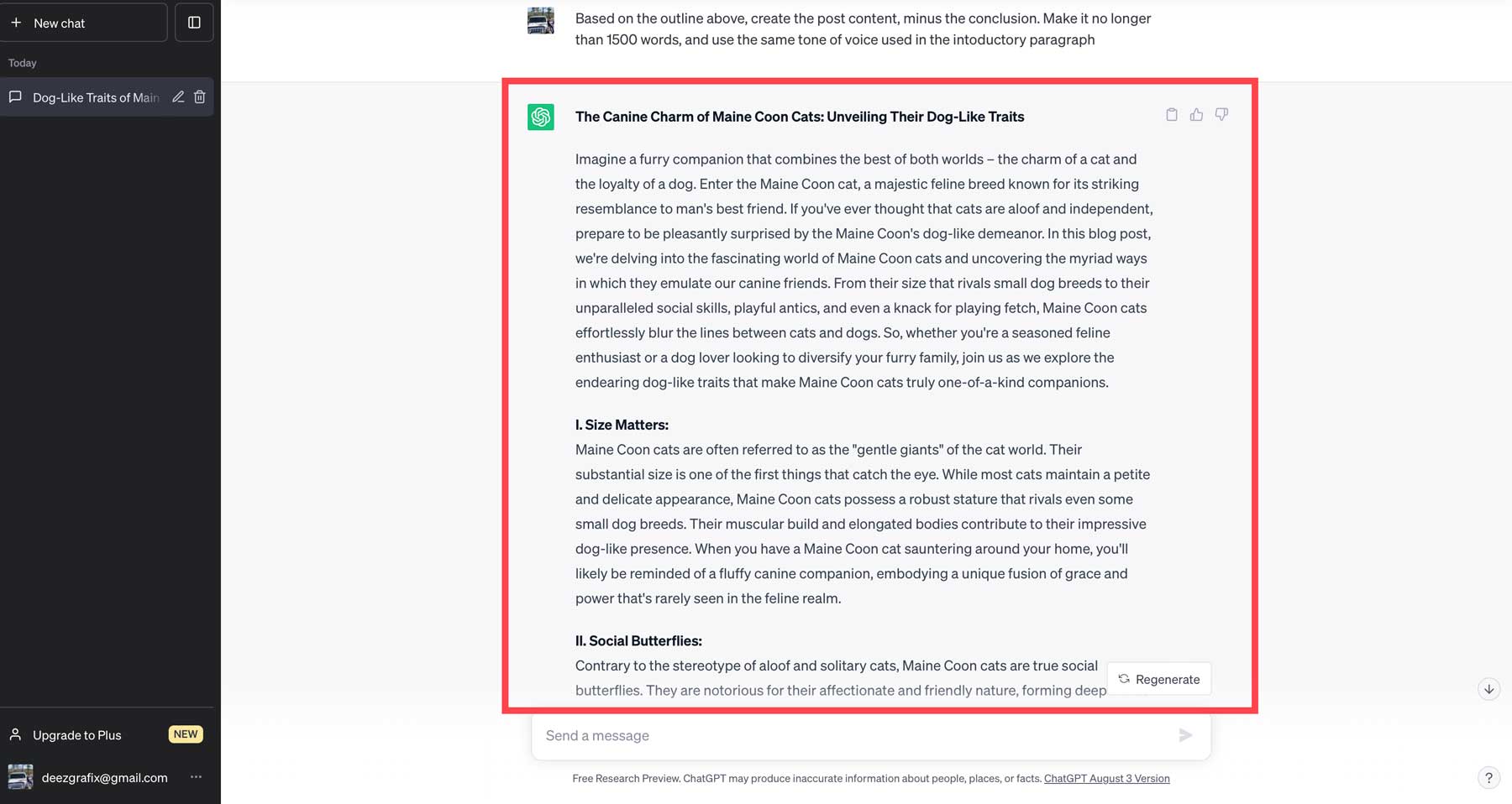 Nous décrirons les étapes pour créer un aperçu de blog à l'aide de ChatGPT. Bien que cette étape ne soit pas nécessaire, elle vous aidera à former vos pensées et vous donnera une structure à suivre pour l'IA. Si vous ne l'avez pas déjà fait, créez un compte avec ChatGPT. La version 3.5 est gratuite, mais vous devez souscrire à un forfait payant pour la version la plus avancée. Pour notre article, nous souhaitons mettre en avant les qualités canines des chats Maine Coon. Nous allons donc utiliser l'invite suivante : Créez un aperçu d'article de blog décrivant comment les chats Maine Coon ressemblent à des chiens .
