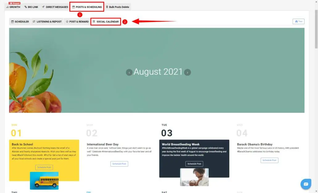 Lorsque tout est prêt, vous pouvez utiliser AiGrow pour programmer votre contenu pour le mois. Ainsi, vous ne manquez plus de publier un jour particulier et votre calendrier de contenu ne sera pas ruiné.