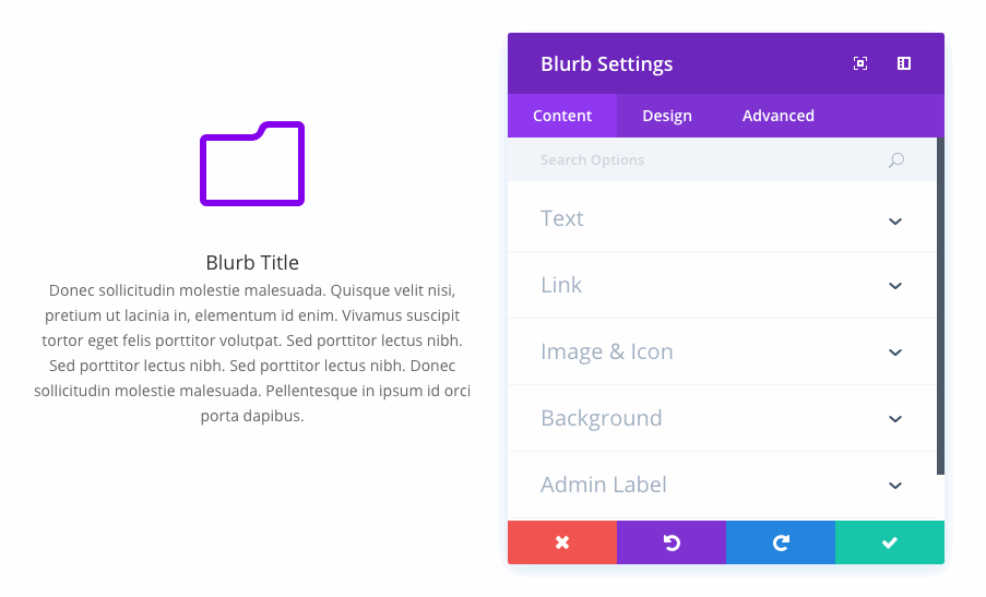 Toutes les options du module sont désormais consultables dans le Visual Builder. Si vous savez quelle option vous recherchez, ouvrez simplement le modal des paramètres et commencez à taper ! Divi trouvera le réglage pour vous.