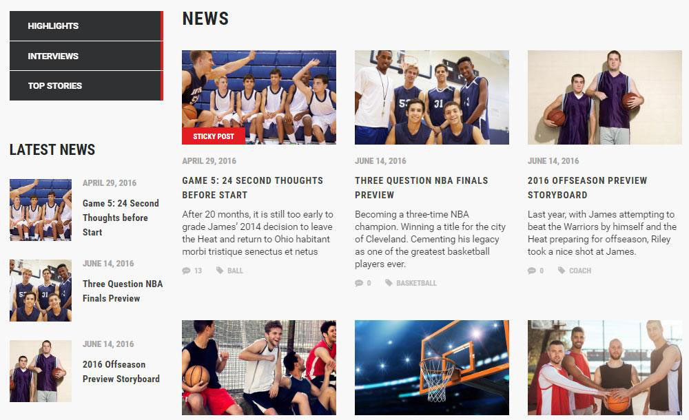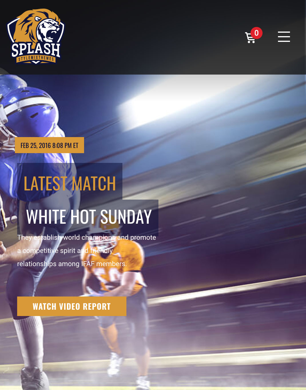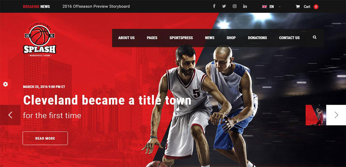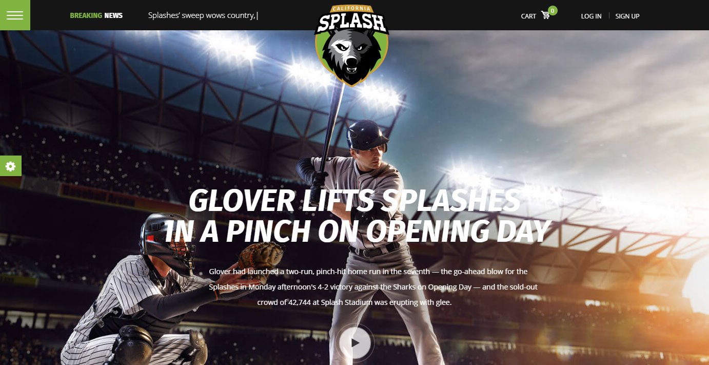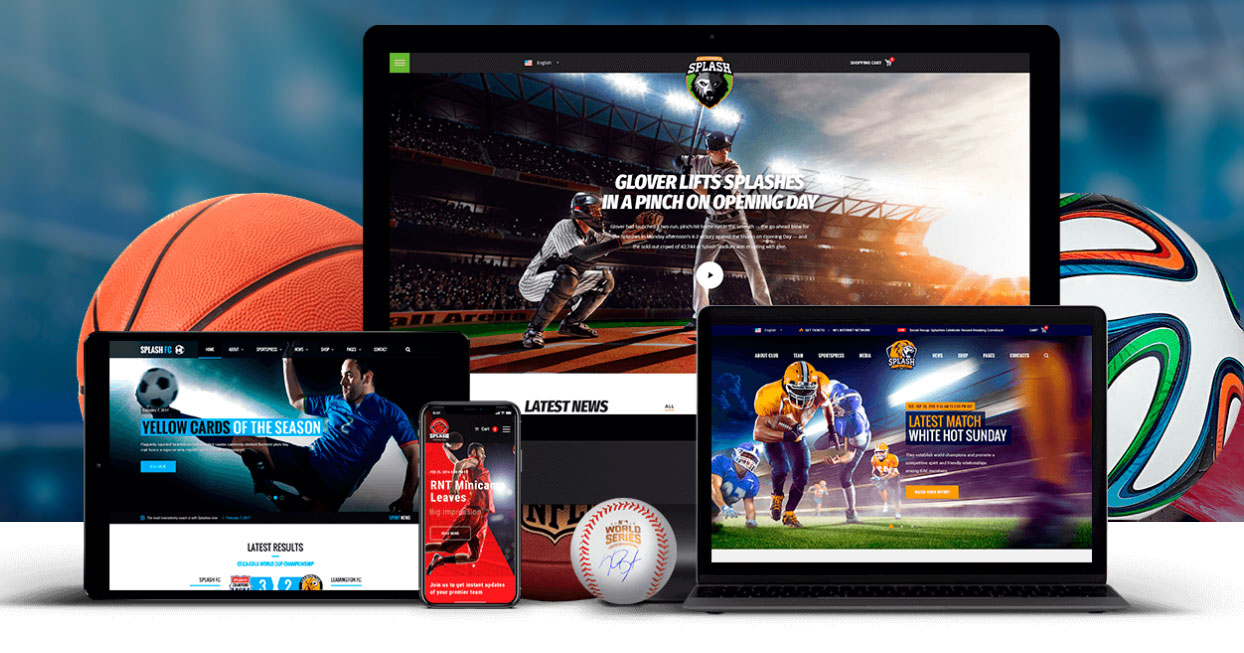 Splash propose quatre démos raffinées pour les équipes de basket-ball, de baseball, de football et de football. Mais le thème est vraiment conçu pour toute organisation de sport ou d'athlétisme, ce qui le rend également idéal pour le hockey, le cricket, le rugby, le volley-ball, les ligues de course, l'athlétisme, etc.