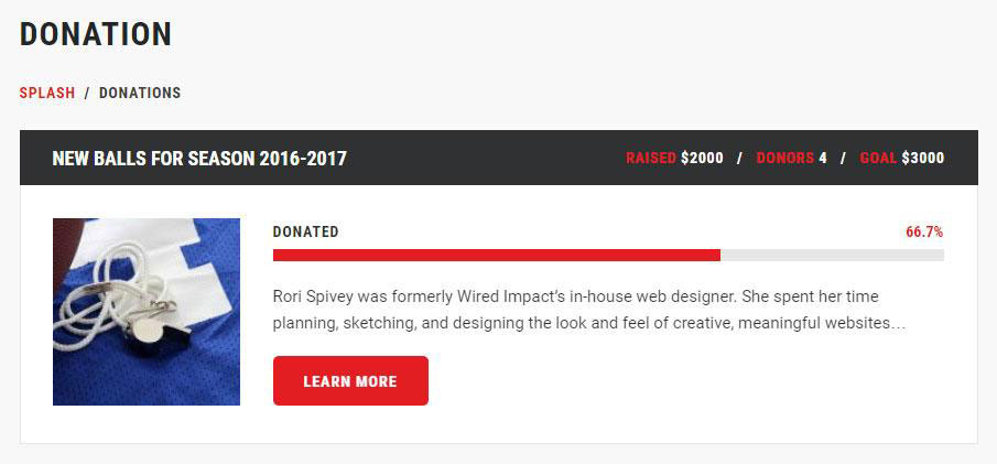 Lorsque vous dépendez de dons et de contributions pour faire fonctionner votre ligue ou que vous souhaitez redonner à votre communauté en lançant une collecte de fonds, le thème Splash facilite le démarrage d'une campagne de dons.