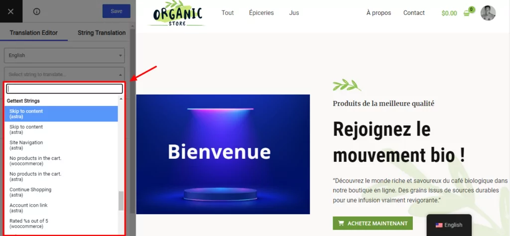 Ensuite, choisissez le texte que vous souhaitez traduire en cliquant sur l'icône en forme de crayon. Après cela, ajoutez votre traduction anglaise et cliquez sur le bouton Enregistrer , comme illustré dans le GIF ci-dessous.
