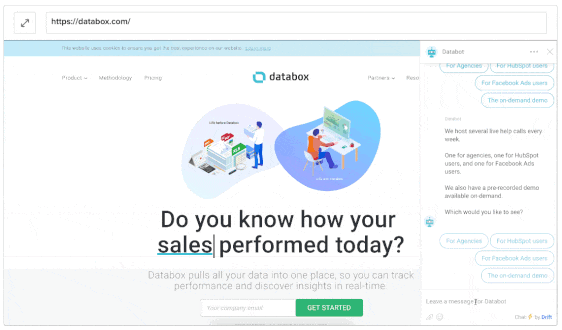 Découvrez comment Databox a un Chatbot dans la barre latérale sur sa page d'accueil pour obtenir des prospects qualifiés. Et ils commencent également à établir la relation avec l'utilisateur tout de suite dans le chat.