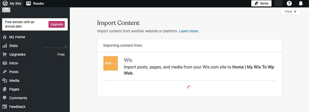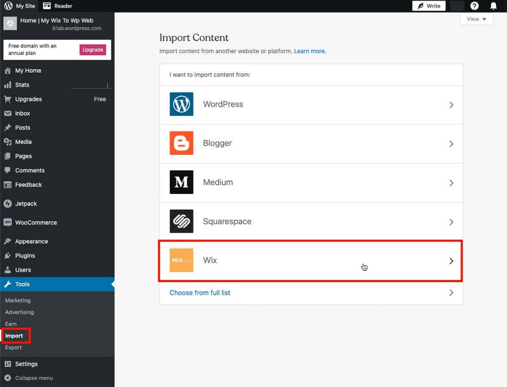Dans le panneau d'administration de WordPress > Outils > Importer , vous trouverez une option pour importer du contenu depuis Wix.