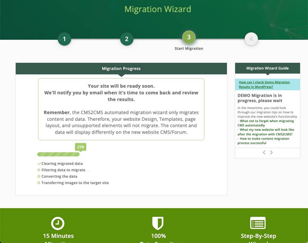 Cliquez sur Démarrer la migration de la démo gratuite , reculez et attendez l'e-mail de confirmation !