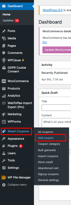 Par défaut, il n'y a pas d'option pour BOGO dans WooCommerce. Nous utilisons le plugin Smart Coupons de WebToffee pour ce tutoriel. La fonction BOGO est disponible uniquement avec la version premium.