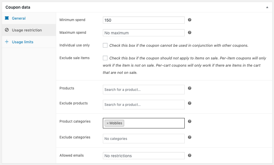 Il est maintenant temps d'ajouter d'autres détails sur le coupon. Les détails du coupon ont été divisés en trois sections par WooCommerce ; Général, Restriction d'utilisation, Limites d'utilisation.
