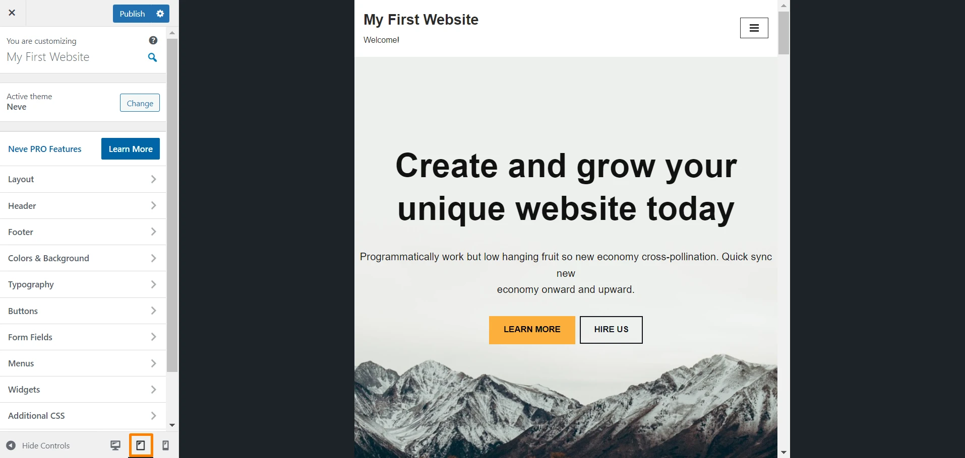 Par défaut, le personnalisateur affichera l'aperçu de votre site Web en mode bureau. Cependant, si vous utilisez les icônes en bas de WordPress Customizer, vous pouvez basculer entre l’affichage sur ordinateur, sur tablette et sur mobile :