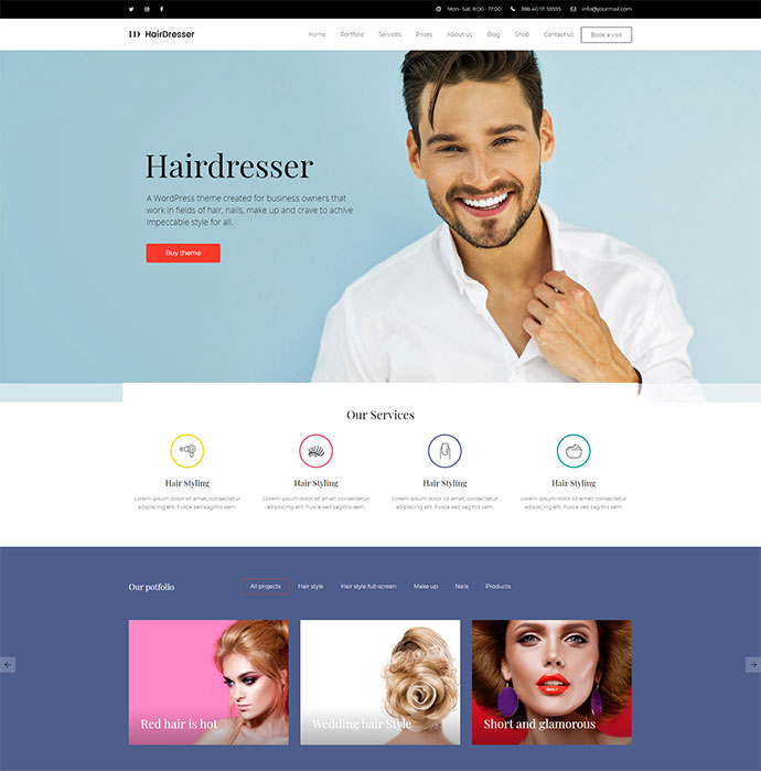 C'est un thème dédié aux salons de coiffure et aux salons de coiffure, aux sites Web de stylistes et aux studios de maquillage. La conception du thème est spécialement adaptée pour répondre à tous les besoins des salons de coiffure - vous pouvez afficher les profils de vos barbiers et coiffeurs, les photos de beauté des cheveux dans le portefeuille, répertorier les services fournis par votre salon de beauté. Il a une mise en page réactive qui répondra à la largeur de votre écran et rendra l'apparence du contenu parfaite sur tous les appareils, des grands écrans de bureau aux téléphones mobiles et tablettes.