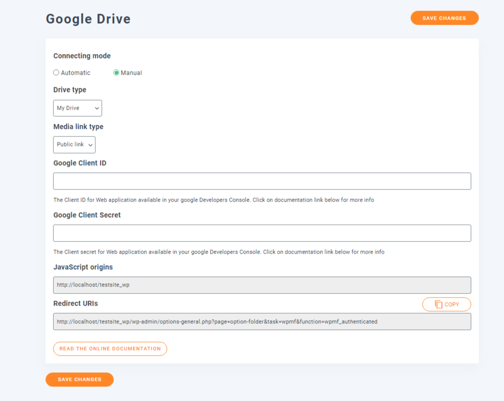 Pour Google Drive et Google Photos, vous devez configurer le type de lecteur, les types de liens multimédias, l'ID client Google et l'ID secret client. Vous pouvez trouver les identifiants sur votre Google Developers Console.
