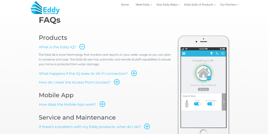Situs ini menempatkan FAQ dalam tata letak dua kolom yang mencakup FAQ di satu sisi dan gambar produk di sisi lain. Tombol beralih menunjukkan judul dan tombol dengan gaya agar sesuai dengan merek situs. Matikan ditempatkan di bawah judul untuk membantu membuatnya mudah diikuti. Di bawah pertanyaan adalah bagian lebar penuh dengan teks besar dan nomor telepon yang dapat diklik yang mengundang pembaca untuk menelepon mereka untuk informasi lebih lanjut.