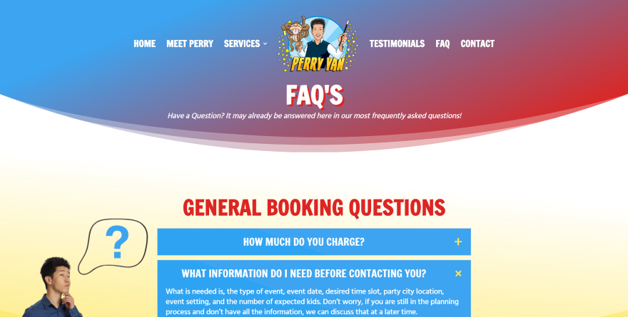 Halaman FAQ ini menggunakan banyak warna kartun yang sangat cocok dengan desain situs web ini. Header berisi judul halaman dan deskripsi singkat. FAQ ditempatkan dalam satu kolom dengan gambar di satu sisi untuk memberikan representasi visual tentang rangkaian pertanyaan tersebut. FAQ itu sendiri disediakan dalam sakelar dan dibagi menjadi topik, yang dipisahkan oleh judul bergaya. Setiap topik ditempatkan di bagian yang berbeda dan setiap bagian memiliki latar belakang dan warna sakelar yang berbeda. Bagian juga menggunakan pemisah gaya. Berikut ini adalah CTA dalam paralaks dengan overlay gradien merah dan biru.