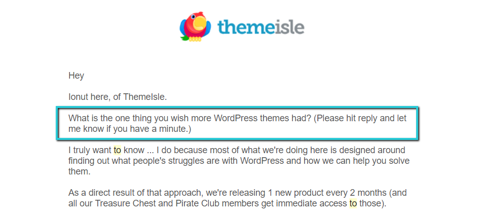 Tetapi banyak perusahaan juga menggunakan pendekatan "tekan balasan untuk memberi tahu saya pendapat Anda" yang lebih personal. Untuk melihatnya, lihat bagaimana ThemeIsle mengajukan pertanyaan umpan balik "apa" langsung dari pendiri: