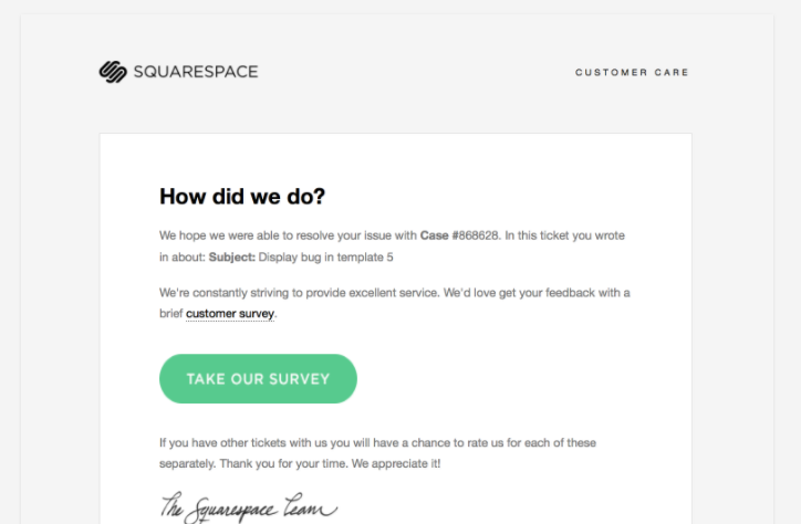 Pertama, satu opsi populer adalah menggunakan email untuk mengarahkan orang ke formulir umpan balik terstruktur. Misalnya, Squarespace mengirimkan tautan ke survei mereka dalam email ( perhatikan pertanyaan "bagaimana" itu lagi?):