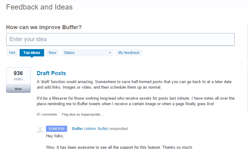 Terkadang, ini mungkin sesederhana formulir kontak atau survei dalam halaman. Tetapi Anda juga bisa berkreasi dengan meminta umpan balik. Misalnya, Buffer memiliki seluruh bagian umpan balik seperti Reddit di mana pengguna tidak hanya dapat mengirimkan umpan balik terbuka tetapi juga dapat memilih umpan balik yang dikirimkan oleh orang lain: