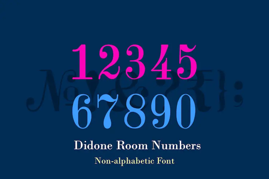 'Didone Room Numbers' adalah font serif bergaya dan modern yang berfokus pada simbol numerik. Itu bagian dari keluarga jenis huruf Didone, yang sempurna untuk tujuan tampilan. Font ini memiliki nuansa unik yang terinspirasi dari nomor kamar hotel tulisan tangan dari Wina, Austria.