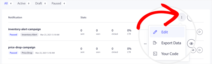 Buka dasbor PushEngage Anda dan buka Kampanye » Kampanye yang Dipicu .