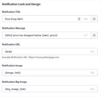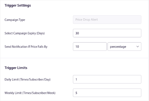 - Bidang Kirim Pemberitahuan Jika Harga Turun adalah yang memicu kampanye Anda. Anda dapat membuat persentase penurunan atau penurunan harga absolut untuk memicu kampanye.