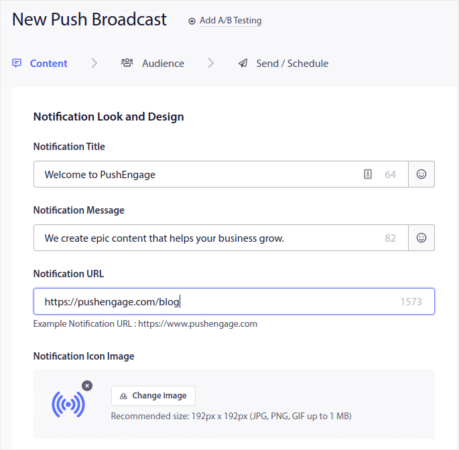 Kemudian, buat pemberitahuan push baru untuk dikirim. Sesuaikan konten di bawah tab Konten :