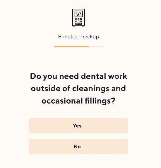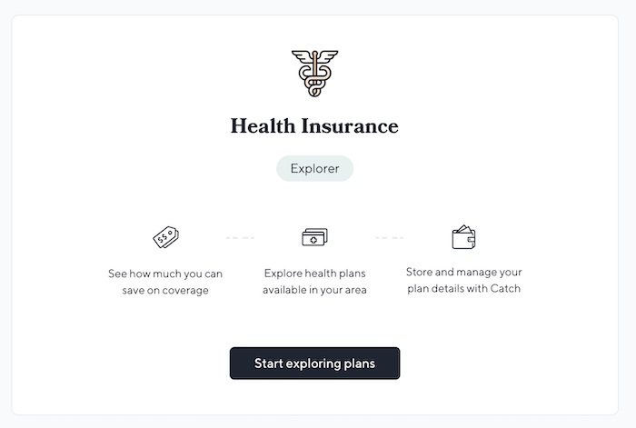 Saya diminta untuk memasukkan kode pos saya sehingga saya bisa mendapatkan pilihan kustom. Karena saya tinggal di New York, saya harus menggunakan pasar kesehatan NYS. Jika saya memilih pertanggungan, Catch akan menyimpan detail polis untuk saya. Sepertinya jika saya tinggal di negara bagian lain, saya mungkin dapat membeli pertanggungan langsung melalui Catch: