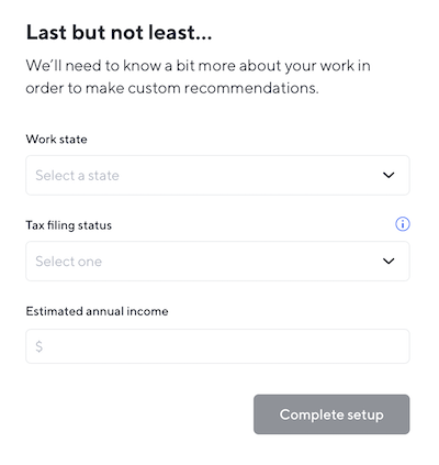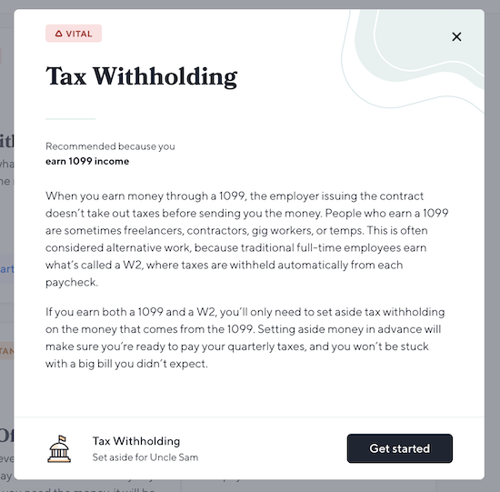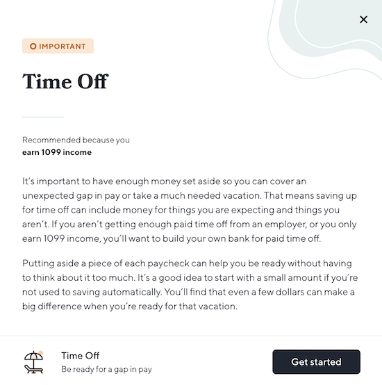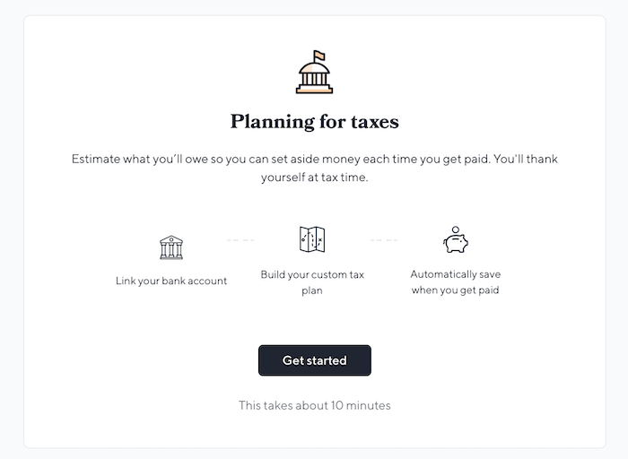 Setelah menautkan rekening bank saya, saya menerima rekomendasi berapa banyak yang harus saya sisihkan per cek gaji untuk pajak. Rekomendasi adalah perkiraan; itu tidak 100% dijamin bahwa ini adalah berapa banyak saya akan membayar pajak. Perkiraan didasarkan pada tanggungan saya, negara bagian, status pengarsipan, dan pendapatan tahunan. Anda dapat mengedit pemotongan Anda jika Anda ingin lebih atau kurang secara otomatis disisihkan.