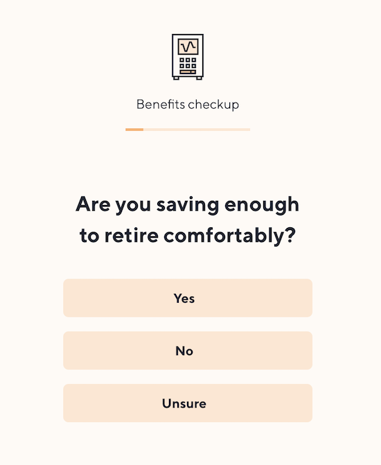 Aplikasi yang mudah digunakan untuk penghematan dasar memang bagus, tetapi ada beberapa keputusan keuangan serius yang harus dibuat di sini dan tidak ada panduan tentang cara membuatnya. Saya tidak dapat menyelami rencana asuransi kesehatan, tetapi opsi pensiun menempatkan keputusan penting di tangan saya tanpa panduan yang cukup tentang apa, tepatnya, yang saya putuskan. Saya merasa tidak nyaman memilih alokasi pensiun berdasarkan paragraf penjelasannya – saya ingin berbicara dengan seorang profesional.