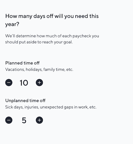 Catat angka persentase dari gaji Anda untuk disisihkan berdasarkan waktu istirahat yang direncanakan dan tidak direncanakan. Bagi saya, ini terasa seperti persentase yang berubah-ubah – saya tidak yakin bagaimana Catch menentukan persentase yang secara pribadi saya butuhkan atau ingin simpan. Apakah saya menabung berdasarkan berapa hari saya tidak bekerja? Atau apakah saya menabung berdasarkan hal-hal yang ingin saya bayar? Tidak jelas, dan tidak ada opsi penyesuaian selain menyesuaikan hari libur Anda.