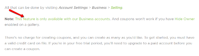 Misalnya, lihat bagaimana Smugmug mengingatkan pelanggan bahwa untuk menggunakan fitur super keren yang disebutkan di artikel bantuan, pelanggan harus menggunakan paket Bisnis atau lebih tinggi: