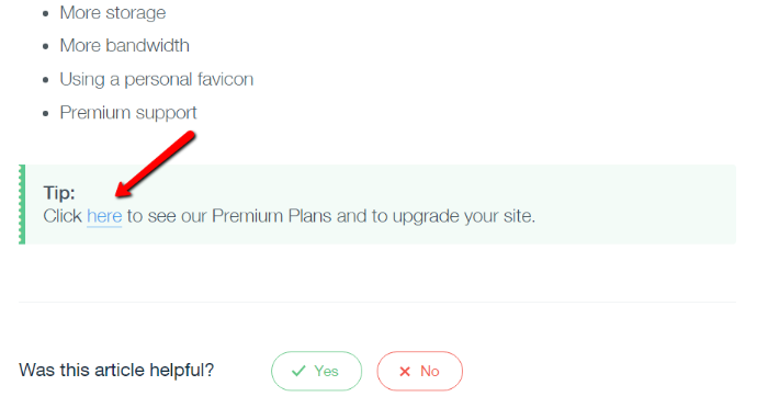 Misalnya, lihat bagaimana Wix menyertakan ajakan bertindak untuk meningkatkan ke paket premium mereka di akhir beberapa artikel bantuan yang relevan: