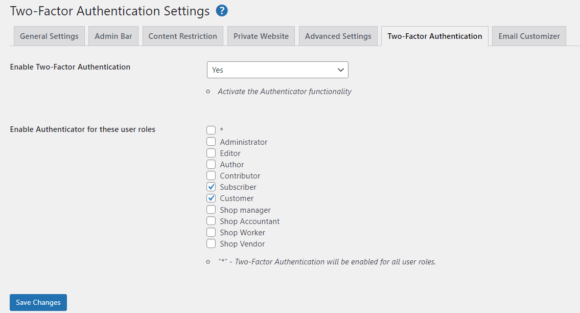 Jika Anda ingin membuat situs Anda lebih aman, Anda dapat membuka tab Autentikasi Dua Faktor dan mengaktifkan fitur ini di situs Anda. Anda bahkan mungkin ingin mengaktifkannya hanya untuk pengguna tertentu, seperti pelanggan dan pelanggan: