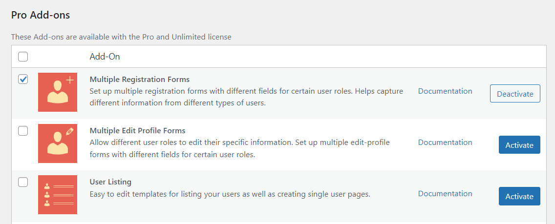 Jika Anda ingin membuat beberapa formulir pendaftaran untuk jenis pengguna yang berbeda, buka Pembuat Profil → Pengaya dan klik untuk mengaktifkan modul Beberapa Formulir Pendaftaran :