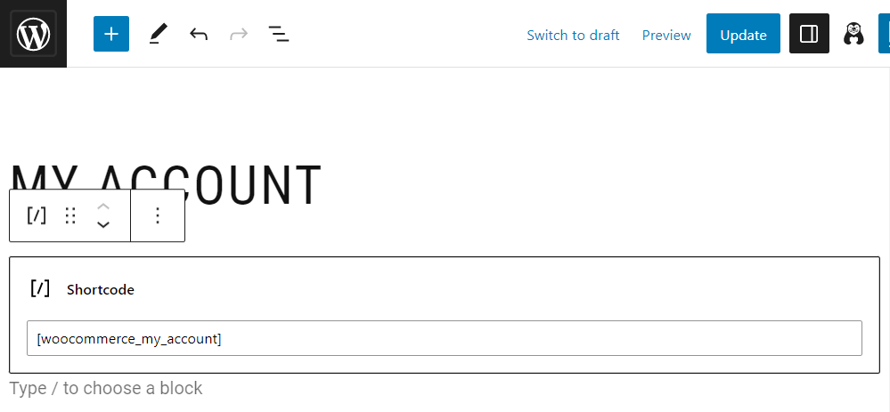 Pertama, buka halaman tempat Anda ingin menampilkan formulir. Jika ingin menggunakannya untuk toko online, Anda harus mengedit halaman Akun Saya yang dibuat saat menginstal WooCommerce. Alternatifnya, Anda mungkin memutuskan untuk membuat halaman baru.
