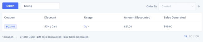 Di Metorik, Anda dapat melihat lebih banyak data tentang penggunaan kupon, termasuk jumlah yang sebenarnya didiskon dan secara signifikan, penjualan yang dihasilkan oleh kupon: