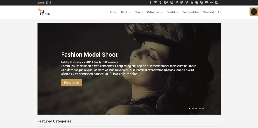 Prutah Blog menyajikan posting blog dengan beberapa modul yang membagi posting berdasarkan kategori. Judul untuk setiap bagian diberi label berdasarkan kategori untuk membuat tata letak bergaya majalah. Slider posting menampilkan semua kategori dan diikuti oleh bagian kategori unggulan dari uraian dengan gambar, tag kategori, dan overlay animasi untuk masing-masing kategori. Muncul dengan 7 halaman yang mencakup halaman arsip kategori. Ini juga termasuk preloader dan ikon sosial. Bilah sisi bergaya menampilkan postingan unggulan dengan gambar mini.