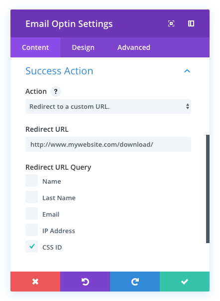 Bersama dengan opsi Pengalihan URL, Divi juga memungkinkan Anda untuk menangkap nama dan alamat email pengunjung dan memberikannya ke URL pengalihan sebagai argumen kueri URL sehingga Anda dapat memasukkan data tersebut ke sistem lain jika diperlukan.