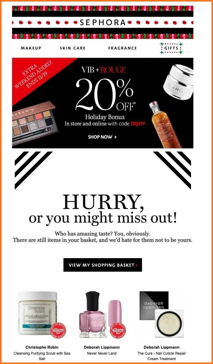 - Email tersebut berisi insentif untuk menyelesaikan pembelian . Ini bisa berupa pengiriman gratis, diskon untuk item di keranjang, atau bahkan bonus poin loyalitas. Ini memberi pelanggan Anda dorongan ekstra untuk melakukan pembayaran.