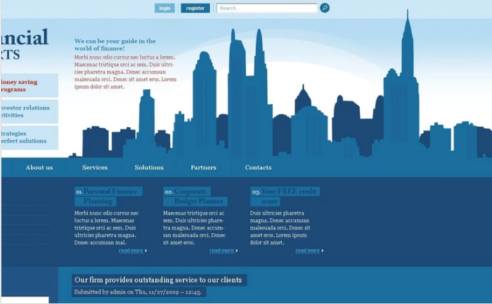 Fininvest adalah perdagangan hari ini, Templat PSD Keuangan. Ini sangat cocok untuk situs web perusahaan seperti panduan keuangan, Akuntan, Perusahaan konsultan, dan banyak lainnya.