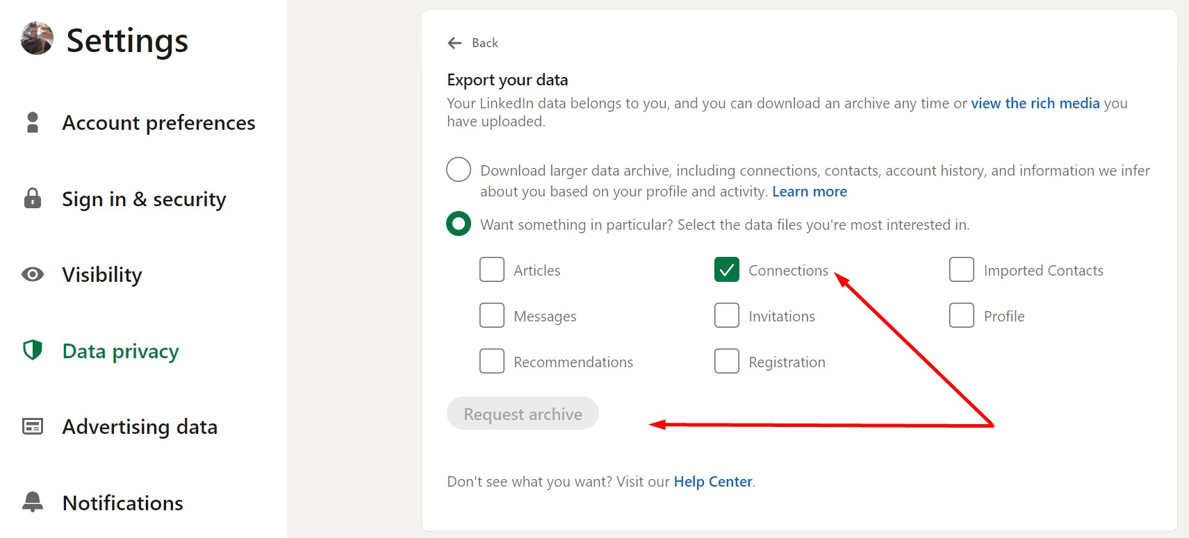 Anda kemudian dapat memilih " Privasi Data " dari menu di sebelah kiri dan klik " Dapatkan salinan data Anda " di bawah tab " Bagaimana LinkedIn menggunakan data Anda ".