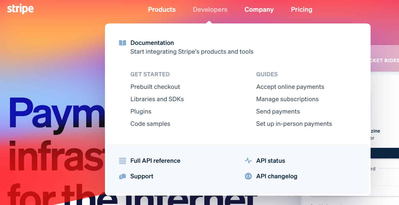 Salah satu contoh megamenu favorit kami dapat ditemukan di Stripe.com. Saat Anda mengarahkan kursor ke elemen menu, alih-alih dropdown sederhana, Anda akan disajikan dengan koleksi yang terisi dengan baik.