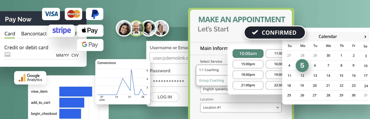 Untuk memastikan kelancaran transaksi dengan setiap penyewaan peralatan, Anda perlu menyiapkan gateway pembayaran. Plugin Janji Temu MotoPress menawarkan berbagai opsi pembayaran, seperti PayPal, Stripe, Apple Pay, Google Pay, dan masih banyak lagi.