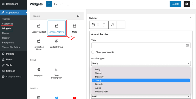 Mulailah dengan menginstal dan mengaktifkan plugin Arsip Tahunan. Setelah itu, Anda dapat menuju ke halaman Penampilan »Widget dan seret widget Arsip Tahunan ke bilah sisi Anda.